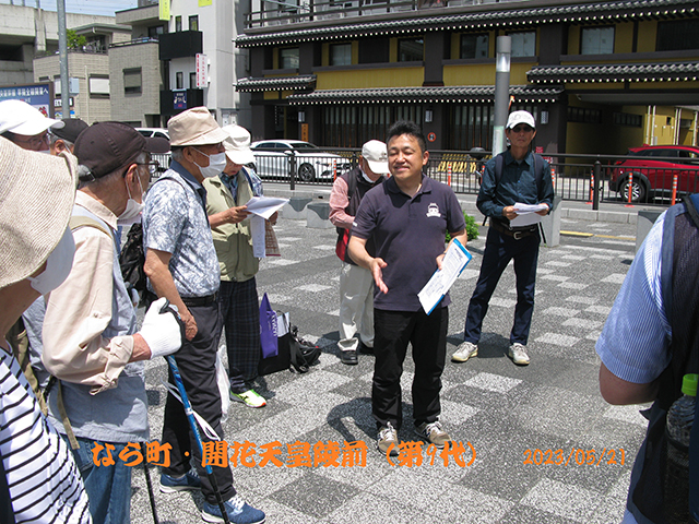 まず、三条通が平城京三条大路や春日大社参道であることの説明があり、JR奈良駅を出発して最初の訪問地第9代開化天皇陵へ向かった。開化天皇陵は全長105mの前方後円墳である。開化天皇は欠史8代の天皇の一人で、実存が疑われている。