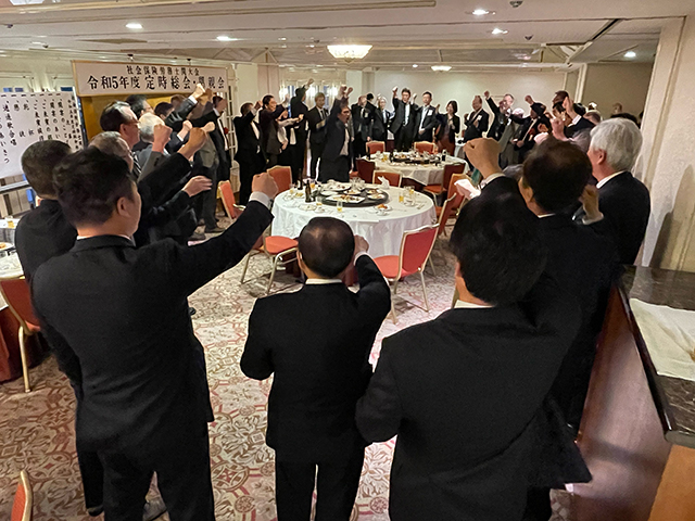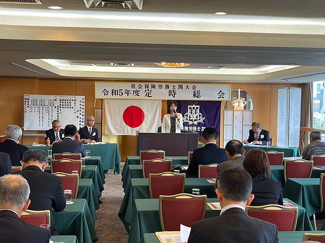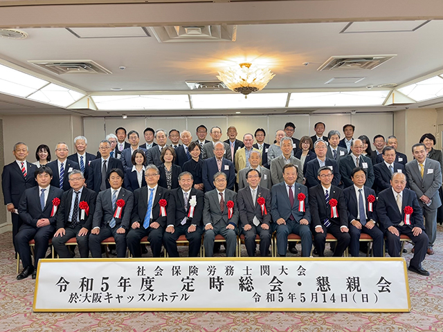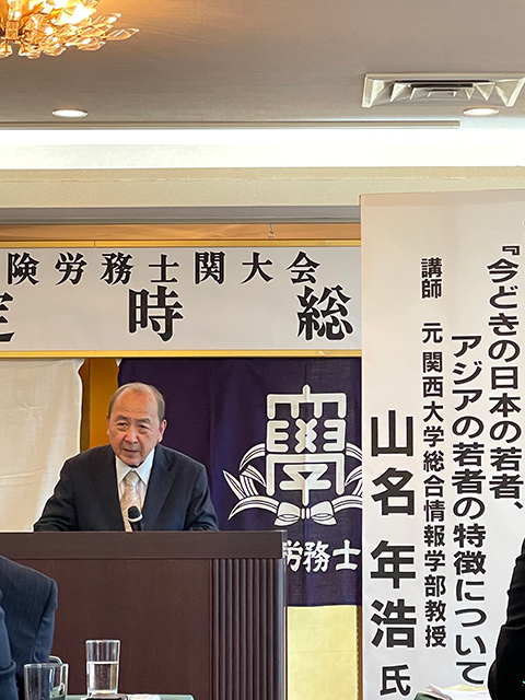大阪キャッスルホテルにおいて、「社会保険労務士関大会令和5年度定時総会」を開催。第一部の定時総会では、事業報告・決算及び予算議案・役員改選等が決議されました。第二部の講演会では、元関西大学総合情報学部教授の山名年浩先生に「今どきの日本の若者・アジアの若者の特徴」と題してご講演いただきました。第三部の懇親会からは、矢野秀利専務理事、田中義信校友会長、荒堀善文校友会事務局長他、各士業の職域会代表の皆さまをお招きし、美味しいお酒と料理を堪能しながら歓談しました。