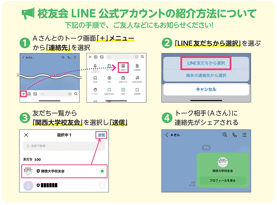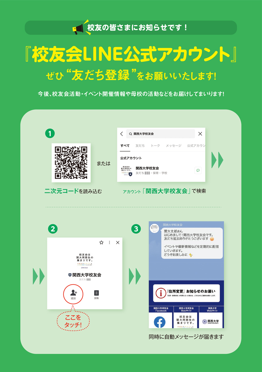 【お知らせ】校友会LINE公式アカウントについて 2023年05月18日 2022年より『校友会LINE公式アカウント』を始めました。下記の二次元コード読み込み、または、アカウント「関西大学校友会」で検索のうえ、ぜひ"友だち登録"をお願いいたします。校友会LINE公式アカウントをご友人などへ紹介いただく際の手順は下記のとおりです。お知り合いの校友の方々にもぜひお知らせください。