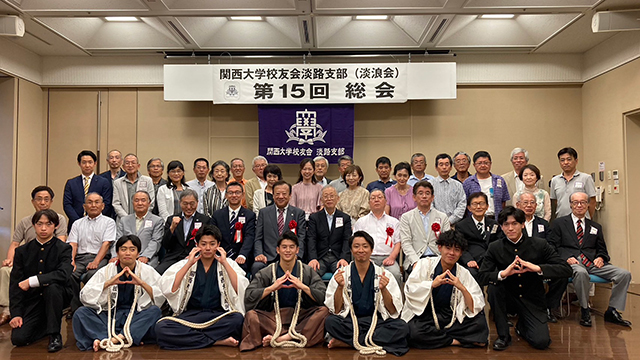 第15回の節目ということで、応援団をお迎えしました。はじめは、公開講座(地域連携活動)。続いて総会を開催。支部長の挨拶、来賓の田中校友会長のご挨拶、そして議案承認。その後は、リラックスタイムとして椅子ヨガレッスン。続いて懇親会、応援団の演舞が始まりました。「ガンバレ淡路、フレーフレー淡路」の演舞が圧巻!応援団最前列に記念撮影。