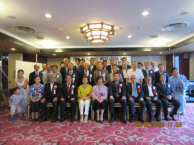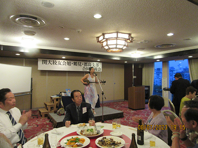 鶴見支部におきましても、久しぶりに話が弾むなかで、議案1号から第3号議案(R5年度の事業計画、予算など)までスムースな討議を終え、また旭、都島支部も同様に総会は終了し、来賓を交えた集合写真撮影も終え、さあ3支部合同懇親会の始まりです。玉置さん(都島支部)の司会で、学歌斉唱、香西都島支部長の開会挨拶、芋縄校友会副会長、仁井市内支部連合会長の来賓挨拶。桂小留師匠の落語で場もくつろぎ、校友会事務局中西さんの乾杯の音頭で楽しい宴会が始まりました、