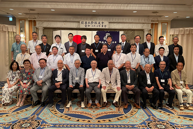 講演は、剣道部OBの秋丸隆士さん(昭和44年経)の「日本剣道史と関大剣道部の歴史と戦績」、また佐々木明男さん(昭和57年経)と野末敏郎さん(昭和62年文)による「剣道形」の演武が行われました。懇親会では、法元名誉会長の88歳米寿のお祝い品贈呈、新入会員紹介など、和気あいあいと楽しいひと時を過ごしました。