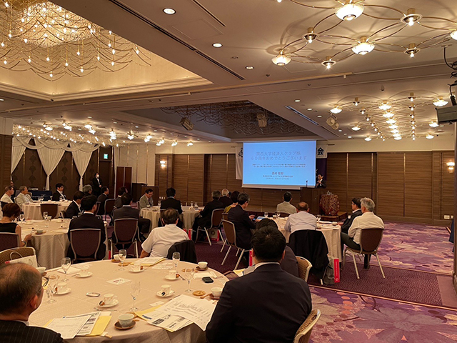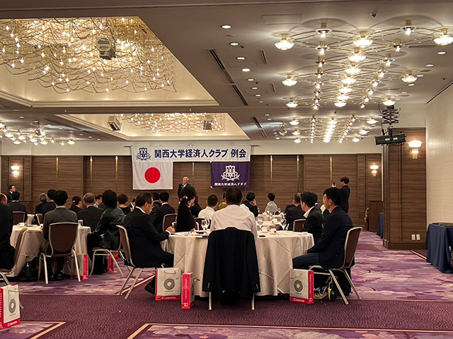 阪新阪急ホテル紫の間で、関西大学経済人クラブ第239回例会が、オンラインとハイブリッド形式で、ご来賓・会員・ゲスト参加者を合わせて62人で開催されました。