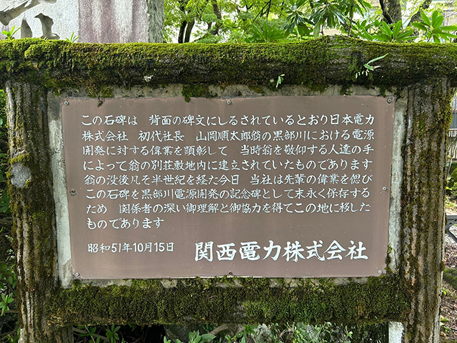 宇奈月駅からトロッコ電車に乗るときに、お寿司のお弁当が配られ、絶景を楽しみながらのランチ。このトロッコ電車は、黒部の電源開発のために1927年に運転を開始したもので、いまでも、各発電所へは道路が無いため、このトロッコが唯一の交通手段だ。1919年に日本電力の初代社長に就任し、電気が人々を豊かにする、と急峻な峡谷に調査に入り、その5年後着工した、山岡順太郎の計り知れない信念と行動力。しかもいまでいう再生可能エネルギーである水力発電だ。関西大学の学長に就任したのは1923年。どうしてそのようなことを同時になせるのか?不思議である。トロッコにて1時間、鐘釣駅で折り返したが、山の奥に行くにつれ、その思いは強くなった。15時すぎ、宇奈月駅に戻ると、山岡塾の学生さんら引率者を含め22人が合流して、宇奈月温泉の町をボランティアガイドさんの説明で、1時間程度散策した。黒部川電気記念館、山岡順太郎の別荘があった独楽荘の碑等を見学。黒部市芸術創造センターセレネへ。芝井理事長による講演「経済人 山岡順太郎を巡って」を拝聴。造船と航路開発、宅地開発、教育、電力等の各分野に大きな功績を残したが、金沢の人脈も貴重だったことを知る。芝井先生、このためにたくさんの資料を紐解き、資料も付けてご講義いただき、本当にありがとうございました。