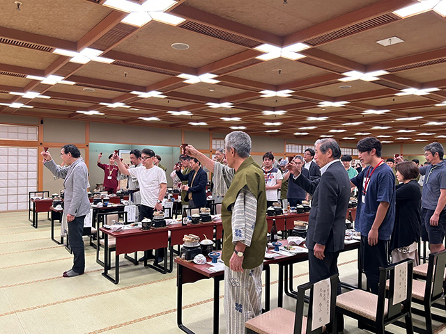 18時頃、宿泊先の延対寺荘にチェックイン。温泉で、早起きと充実したスケジュールの1日の疲れを癒す。宇奈月温泉の開湯も1923年。黒部川の上流から当時は木管で運ばれてきたとのこと。黒部で働く人たちや山岡順太郎自身も大いに癒されたことだろうと思いを巡らす。そして、お待ちかねの大宴会。芝井理事長、前田学長からのご挨拶をいただいたあと、田中校友会長による乾杯で開宴。YKKさんからも、地元のお酒を協賛いただき、美味しい料理に舌鼓を打ちながら、くじで決めた席のお隣に座り合わせたフレッシュな山岡塾の学生さんたちといろんな話ができた。豪華景品を協賛いただいたビンゴゲームでは、私は会長賞のお芋のお菓子があたり、とてもラッキー!芋縄副会長の楽しい大阪締めにて閉会。そのあと、2次会、3次会もあったようです。翌朝、良く晴れて景色抜群。有志で、山岡順太郎のお墓参り。私は、絶景の露天風呂を楽しんでから朝食後周辺を散歩していると、昭和天皇や与謝野鉄幹、晶子の句碑にも出会った。そして、新幹線にて金沢へ。昼頃金沢の「フェスティバルin北陸」会場ホテル金沢へ到着。