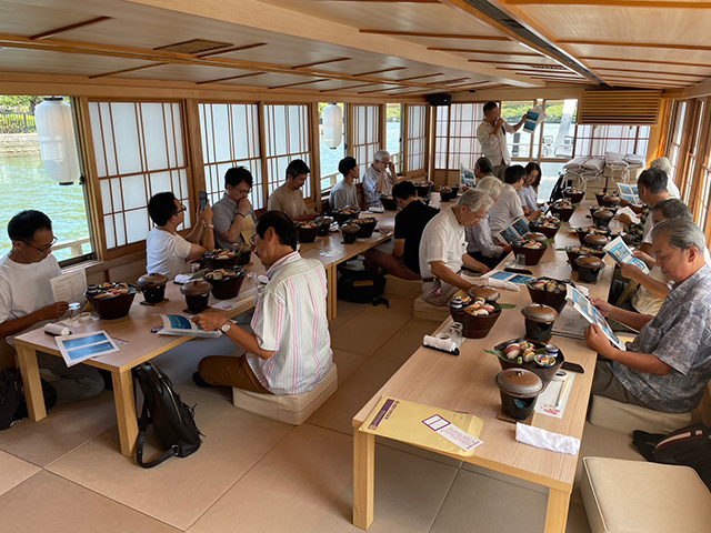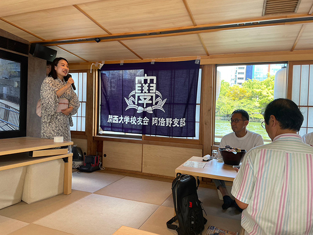 船は天満橋・八軒屋浜を出発し、村上康司支部長の挨拶からまずは総会がスタート。「全国の支部総会のなかでも支部長が短パンで挨拶しているのはここ阿倍野支部ぐらいかも」と言って笑いを取った後に支部活動の報告や収支報告を行いました。そして田中義昭校友会副会長から激励のお言葉と校友会活動の報告をいただき、北嶋浩一参与の乾杯で懇親会が始まりました。障子を開けると風が心地よく吹き抜け、船上からの風景も楽しみながら、参加者の皆さまの自己紹介なども行い、大いに盛り上がりました。