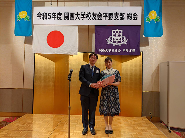 第三部懇親会に先立ち、来賓の池内啓三相談役、前田裕学長、田中義信校友会会長より祝辞とともに母校の近況ご報告をいただき、朝倉満校友会参与の乾杯のご発声により歓談へと続いた。ここでは今年も現役チアリーダー・CLAIRSによる若さはじける素敵な演舞が披露された。平野支部では現役学生、OBの活動の支援を行っている。CLAIRS、そして平野区・摂陽中学校で道場責任者として日本拳法を指導する宮崎文雄副支部長に長谷川孝夫支部長より目録贈呈が行なわれた。