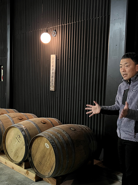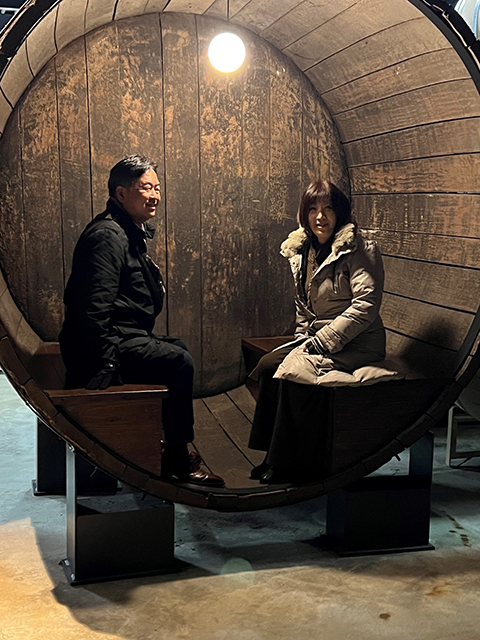 第1部はワイナリー見学会が実施され、ワイナリー内にある工場や売り場等を散策しました。金銅重行幹事から、ワイン作りを始めたきっかけ、本年が90周年(創業1934年)で節目を迎える時期であること、ワインの製法、コロナ禍の苦難、将来のビジョン等、ユーモアを交えて楽しく説明していただきました。河内ワイナリー周辺区域には現在350世帯約1000人しか居住しておらず、次世代の担い手が減少傾向であるため、大手企業との人材交流、芸大生や地元中学生の体験授業の受け入れ等社会貢献を通じて、若い担い手を確保する等さまざまな努力をしていることも聞くことができました。工場内には、使用していた樽のなかに入る体験ができる施設や、1970年大阪万博の頃に実際に使用していたトラクター等が展示されていました。また河内ワイナリーでは事前の申込みをすれば1樽を購入することができ、団体個人を問わず幅広く受け付けをしていますとのご提案もいただきました。