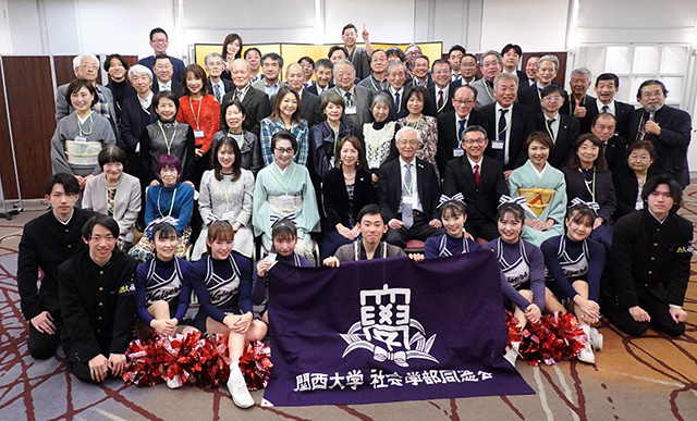 2024年2月17日 大阪新阪急ホテルにて、社会学部同窓会「第三学舎」新年総会を開催しました。社会学部同窓会は2001年に設立されましたが、関大応援団の正式参加は総会含めて初めてでした。第102代森口友翔応援団長指揮での学歌斉唱で背筋が伸びると共に一気に盛り上がりました。