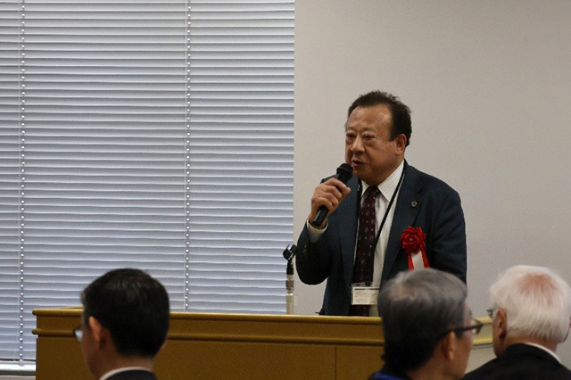 第一部総会では、応援団OB辻本常任幹事の指揮で学歌斉唱から始まり、物故者および能登半島地震で犠牲になられた方々に対し黙祷をささげ、岡田支部長からは多くの校友と出会い、校友の絆をさらに高めていきたいとの挨拶がありました。続いて来賓を代表して田中校友会長及び河田東京センター長から母校や校友会活動の現状報告や、2025年4月にスタートする「ビジネスデータサイエンス学部」の紹介などお話しいただいた。