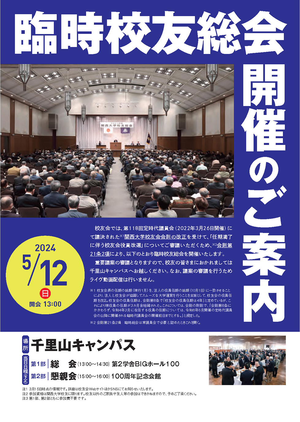 2024年臨時校友総会の開催について(お知らせ) 2024年04月12日 関西大学校友各位校友会では、任期満了に伴う校友会役員の改選について審議をおこなうため、「2024年臨時校友総会」を開催いたします。日時 2024年5月12日(日)13時開会場所 総会(第2学舎BIGホール100) 懇親会(100周年記念会館)共に千里山キャンパス※ライヴ動画配信は行いません。総会、懇親会ともに参加費不要、事前申込も不要です。多くの校友の皆さまのご参加をお待ちしております。詳細は以下案内をご覧ください。関西大学校友会