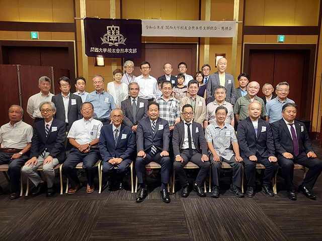 令和6年7月20日(土)熊本県支部(野々口瑞穂支部長)は、ホテルメルパルク熊本にて、芋縄隆史校友会副会長、奥田惠造校友会事務長をはじめ、九州各支部代表(北九州、福岡、佐賀)、と交流大学の関西学院、同志社、立命館の熊本支部代表の方々を来賓にお迎えし、総勢33人の出席のもと令和6年度の熊本県支部総会・懇親会を盛大に開催した。