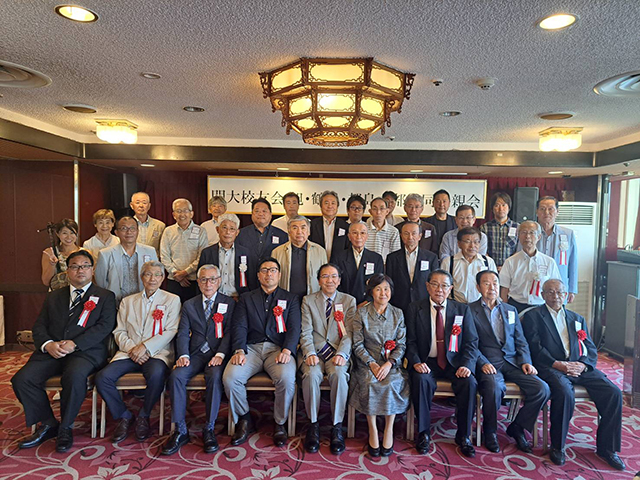 次に懇親会場にて、来賓を交えた集合写真、さあ3支部合同懇親会の始まりです。玉置さん(都島)の司会のもと、学歌斉唱、香西都島支部長の開会挨拶、仁井校友会副会長、前田 裕学長の来賓挨拶の後、校友会事務局 中西 正樹さんの乾杯の音頭で楽しい宴会が始まりました。