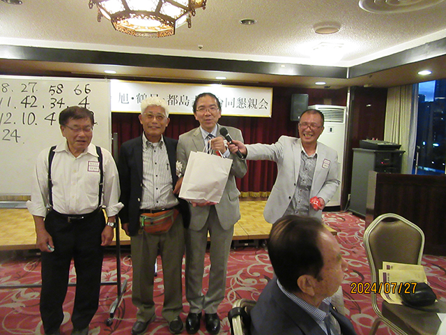 次に鶴見支部恒例のビンゴゲームです、井藤さん、田中さん、山本さんにより、楽しい商品をゲットできた校友は満足で、ニコニコ顔です、ちなみに私も当たりました。また、生野支部長 馬淵純一さんの逍遙歌、西支部長 西村輝和さんの大阪締め、楽しい宴も最後に、秋田都島支部長の閉会の挨拶でお開きとなりました。「また、来年元気で会いましょう」で解散となりました。