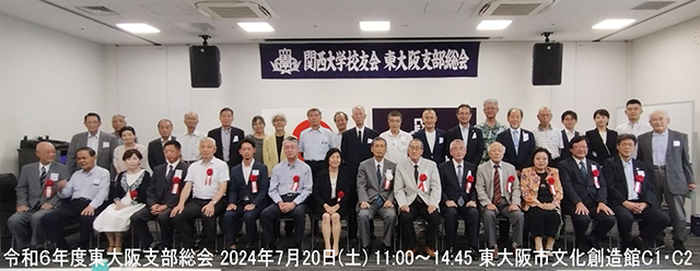 さる令和6年7月20日(土)、東大阪市文化創造館にて関西大学校友会東大阪支部の総会が行われました。来賓として校友会副会長、仁井ひろみ様をはじめとして河内近隣支部の役員の方々、市役所千陵会副会長をお招きして37人が参加しました。