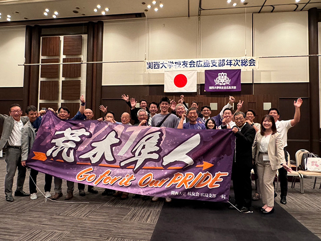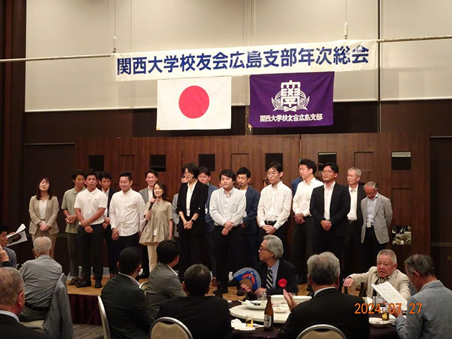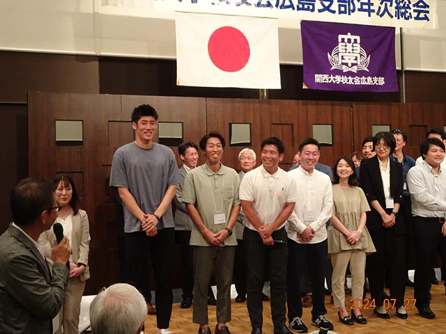 校友会本部から田中義昭副会長様、永尾俊一組織部長、事務局の村上晋様、近隣の山口千里会、備後支部、岡山支部、福岡千里会、芦屋支部、そして関西学院大学校友会広島支部からの来賓9人をお迎えし、会員64人と合わせて総勢76人のご参加をいただきました。懇親会では、特別ゲストとしてJリーグ・サンフレッチェ広島の荒木隼人選手(H31商学部卒)にご参加いただき、初参加者20人のご紹介や豪華景品の抽選会などで大いに盛り上がりました。