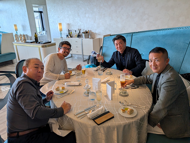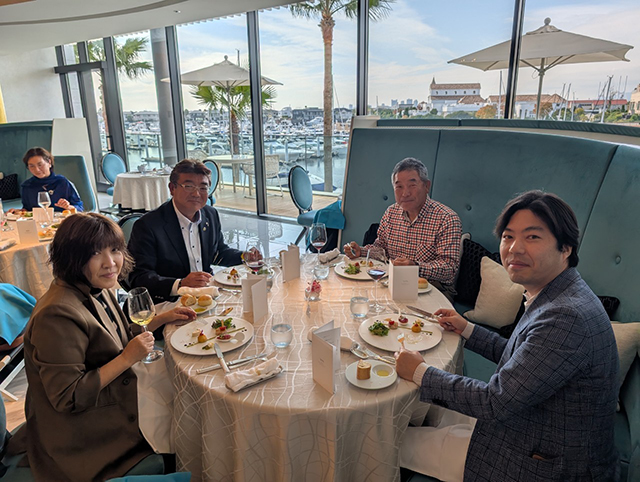 第2部は「芦屋ベイコート倶楽部」に移動し、懇親会をおこないました。海が広がる絶景を前に、豪華なコース料理を堪能し、大変素晴らしい会となりました。バスの中でも各人から近況報告の発表などを順番におこない、和気藹々と交流を図りました。前田由利副会長の挨拶により、盛況のうちに閉会となりました。