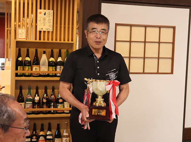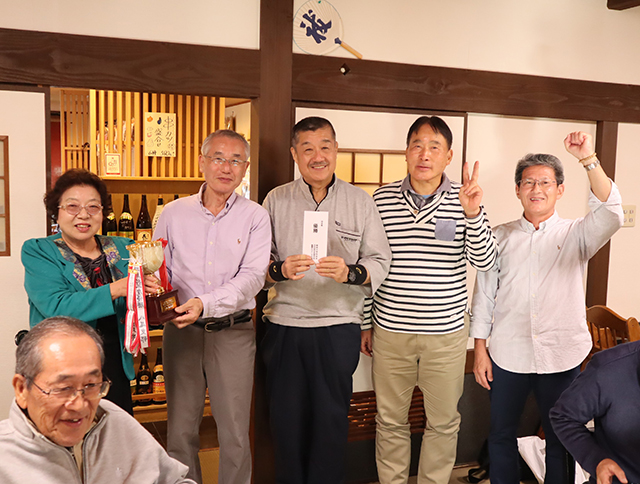 試合後、近くの「うどん山川」で、表彰式と懇親会を行い、会員間の親交を深めました。表彰式後、194のハイスコアを一投目に出した柏原支部副支部長の寺前さんは、恩智区長として有名な恩智神社の太鼓台新調事業に数年越しで取り組み、前日の11月2日に新しい布団太鼓の御披露目を行ったばかり。莫大な資金集めから始まった大仕事を成し遂げて、「優勝したかったけど、さすがに疲れたわ」と、100点に届かなかった2投目の大失速を大いに残念がっていました。
