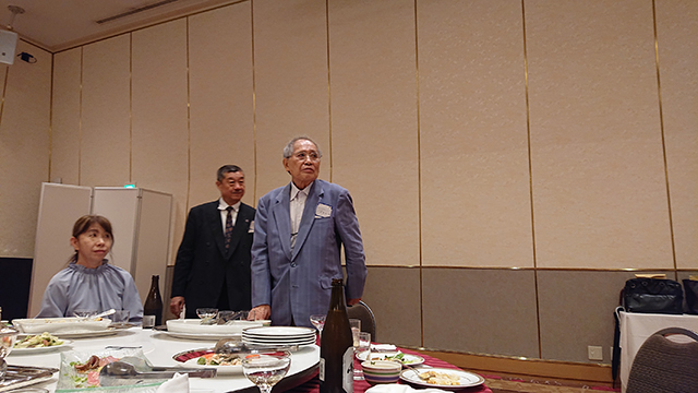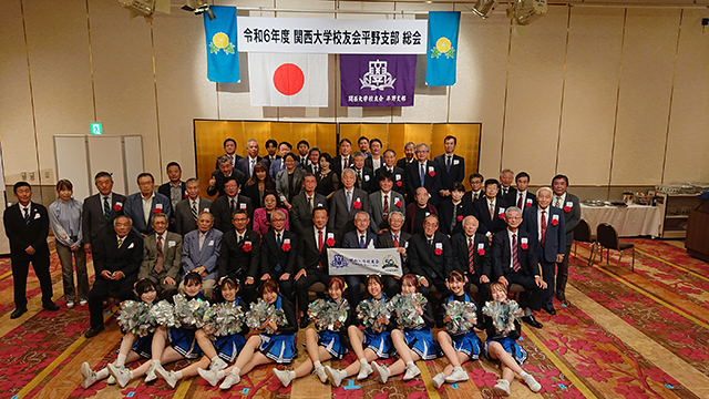 第三部では、懇親会に先立ち来賓の、学校法人関西大学・土橋良一常務理事、田中義信校友会会長、井本暁人大阪市内支部連合会副会長より、祝辞と母校の近況報告をいただき、加藤安宏代議員会議長の乾杯のご発声により歓談へと続いた。ここでは、今年も10名の現役チアリーダー・CLAIRSによる若さはじける素敵な演舞が披露された。また、創立50周年を迎え、創立メンバーの一人である大倉博参与をはじめ、中西建策顧問、大江正則、福井忠成、田中義信の各相談役で平野支部中興の祖ともいえる功労者の先輩方に、長谷川孝夫支部長より感謝状が贈呈された。その光景をながめながら、50年後の支部創立100周年総会では、今回初参加の令和5年卒・福田敦也校友が感謝状の贈呈を受けているかもしれない・・・そんな思いをめぐらせているうちに、逍遙歌合唱となり令和6年度平野支部総会は大団円を描き、お開きとなった。