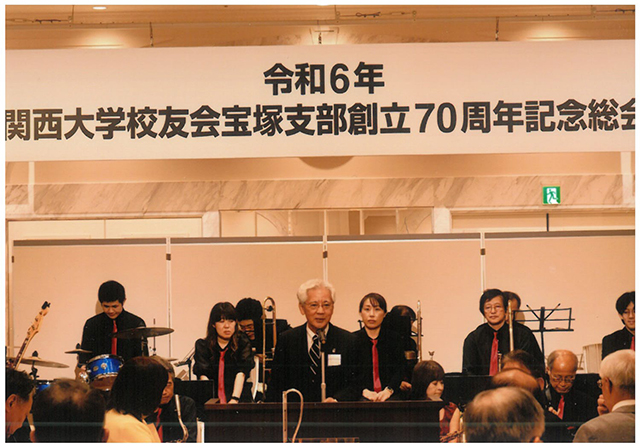 宝塚支部宝塚ホテルで「宝塚支部創立70周年記念総会」を開催 2024年11月02日 令和6年11月2日、宝塚ホテルにおいて、宝塚支部創立70周年記念総会・懇親会を来賓、支部役員、会員及び学生(応援団)、48名の参加のもと開催した。 総会終了後の懇親会では、ジャズオーケストラの演奏 応援団演舞、祝70周年大道芸パフォーマンスで、会場は大いに盛り上がり親睦を深めることができた。 本年(令和6年)は、宝塚市市制70周年記念の年ということで、ご縁を感じる支部総会・懇親会であった。