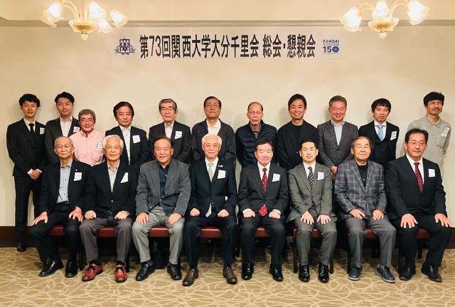 11月16日(土)、第73回大分千里会総会・懇親会が大分オアシスタワーホテルで開催されました。校友会本部と福岡千里会よりご来賓をいただき、初参加の方5名、他大学出身で関大の大学院(法科・会計)出身の方2名を含む総勢20名の会でした。懇親会は、終始和やかな雰囲気の中で行われ、参加者の芝崎明文さん(S59・工)より岐阜県で関大同期生がされているお店から取り寄せたお菓子(お千代稲荷の芋けんぴ)のお土産が全員に配られ好評を博しました。女性、若い校友にもっと参加してもらえるように、工夫をして会を盛り上げて行きたいと思います。