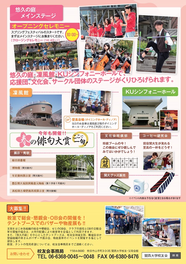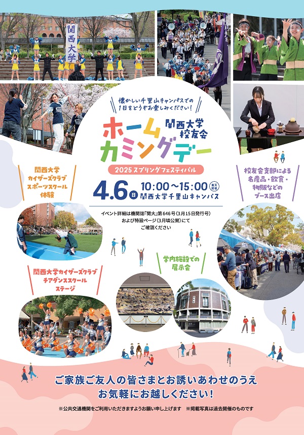【お知らせ】4月6日 ホームカミングデー ~2025スプリングフェスティバル~ を開催 2025年01月16日 ホームカミングデー ~2025スプリングフェスティバル~ を開催いたします。ぜひ、お誘い合わせのうえ、桜の花咲く母校へおかえりください。日時:2025年4月6日(日)10:00~15:00場所:関西大学千里山キャンパス詳細は、後日お知らせいたします。また、特設サイトを3月に公開予定です。