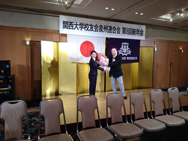 また、西出事務局長からは、今年度の8行事の振り返りと、今・来年度の行事予定などが報告された。尚、直近の岸和田市議会議員選挙で見事当選された岸和田支部永野紗代幹事(文学部・平成21卒)に、花束贈呈があった。永野紗代市議会議員御礼挨拶のあと、記念写真撮影。その後懇親会に入った。