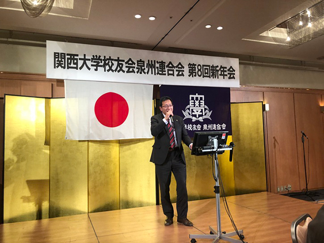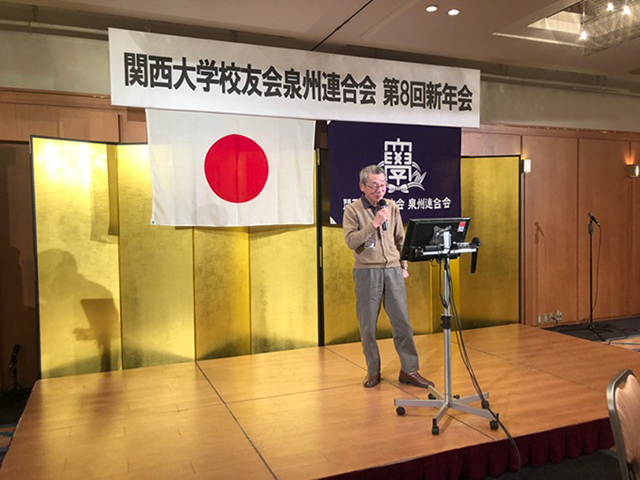 次に、泉州連合会茶谷会長が主催者挨拶され、校友会本部谷康司副会長が来賓祝辞を述べられた。
