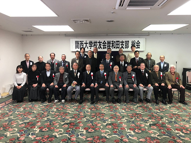 松本六三支部長(昭46・法卒)が代表挨拶をされ、関西大学校友会本部谷康司副会長及び泉州連合会茶谷輝和会長からご祝辞を賜った。