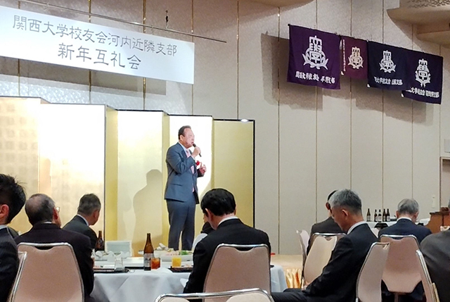 河内近隣の12支部(平野/藤井寺/生駒/八尾/河内長野/橋本/柏原/松原/富田林/羽曳野/大阪狭山/東大阪)合同の新年互礼会が大阪上本町ホテルアウィーナ大阪4F金剛にて、来賓4名・河内近隣支部80名・ゲスト1名合計85名の出席者で開催されました。