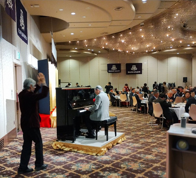 今回は、ゲストとしてお招きしたジャズピアニスト・作曲家・編曲・音楽プロデューサーと幅広く活躍しておられる学友の大塚善章様(1952年入学)のピアノ演奏とお話しを約40分間拝聴し、その後河内近隣支部からの活動報告でおおいに盛り上がりました。
