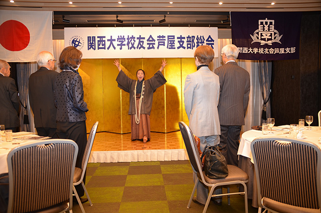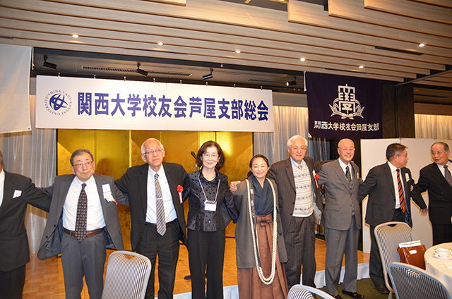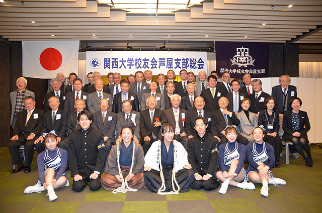 応援団第103代団長の指揮により参加者一同が心をひとつにして高らかに学歌を斉唱し、芦屋支部総会の幕が上がった。依藤支部長の挨拶に引き続き、来賓を代表して芝井敬司理事長、田中義昭校友会副会長にお祝いの言葉をいただいた後、議事として、事業報告・会計報告・監査報告・事業計画が承認された。