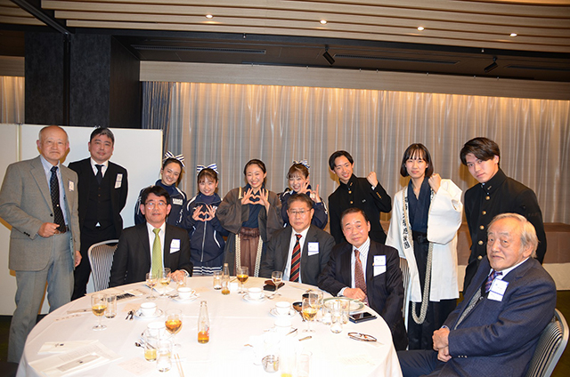 懇親会の部は、昨年に引き続き、昭和32年卒である冨田会員の音頭により乾杯がなされ、和やかな会が幕を開けた。今年も、各テーブルには1つ余分の席が設けられており、参加者は自由に各テーブルを回って、空いた席に座ったり、立ったまま身振り手振りを交えたりしながら、多くの参加者との懇親を楽しんでいた。応援団が披露してくれた演舞演奏は力強さと華麗さと懐かしさに溢れ、参加者の心はひとつになった。