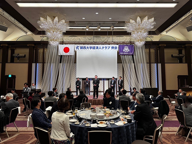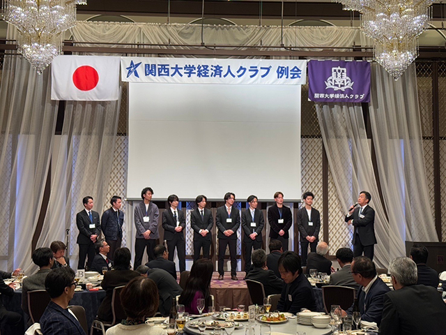 第2部では、来賓のご紹介、そして芝井敬司理事長、田中義信校友会会長よりご挨拶を頂いた。そして、池内啓三顧問に乾杯のご挨拶の後、懇親会がスタートした。歓談中には、特別参加した現役学生たちが高橋様と楽しく会話を行っており、今までにない校友会の新しい景色が垣間見られた。会場が活気にあふれたところで新入会員・ゲスト参加者の紹介があり、浅田美明副会長のご挨拶で盛況のうちに閉会となりました。次回の総会及び例会は5月12日(月)に予定しています。
