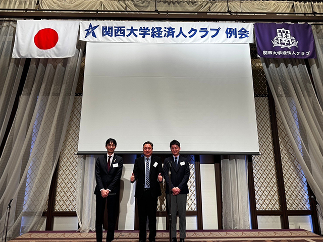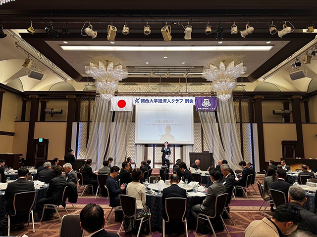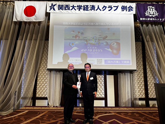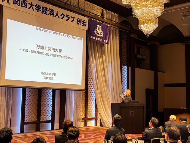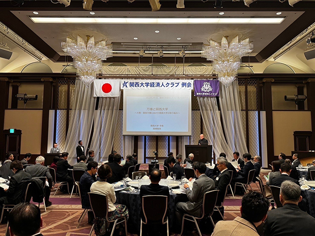 副学長時代から取り組まれてきたこちらに関しては、特に重要視されてこられたとのことで、教育研究機関である関西大学が何故万博なのか、その哲学があってこそ良い取り組みができると冒頭に述べられた。さらに具体的には4つの項目/根拠があるとのことで、ひとつひとつの説明がなされた。①「歴史」 関西大学は大阪で生まれ育まれてきた大学である点 ②「SDGs」 関西大学はこの言葉が生まれる以前からSDGs に取り組んできた点 ③「学生」 学生にとっては一生に一度の機会であり、関大万博部も発足している点(現在140人/9チームの構成)④「校友会」 経済人クラブも含めた、51万人140以上の支部で校友との繋がりを強めている点 上記4つの点だからこその万博である、という強い指針であった。