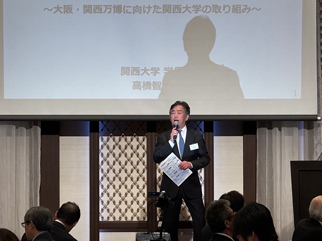第1部では、永尾俊一会長のご挨拶ののち、関西大学第44代学長 高橋智幸先生より「万博と関西大学」のテーマでご講演を頂いた。このテーマに対して、「何故、関大が万博に取り組むか」、そして「関大がどう取り組むか」のそれぞれについて具体的なお話がなされた。