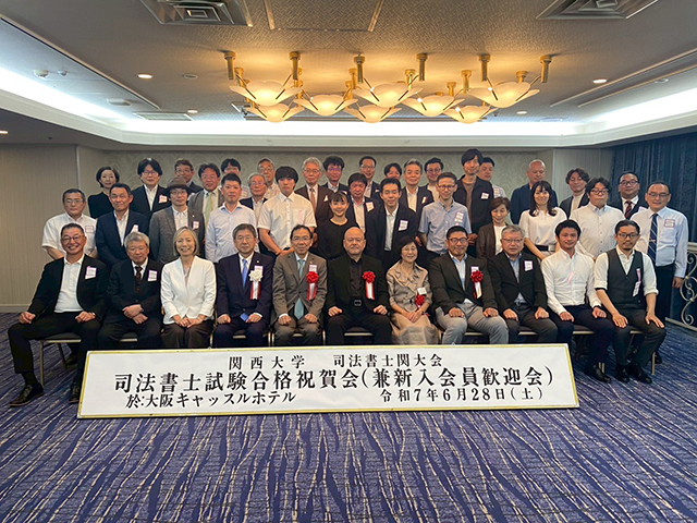 令和7年6月28日(土)、大阪キャッスルホテルにおいて、関西大学出身の司法書士試験合格者を祝う「合格祝賀会(兼 新入会員歓迎会)」が盛大に執り行われました。関西大学より高橋智幸学長、前田裕常務理事、また校友会からは仁井ひろみ副会長、事務局中西正樹様を来賓としてお迎えし、令和6年度合格者9名と会員を合わせ総勢43名が出席しました。合格者の皆さんは司法書士関大会の一員として新たな一歩を踏み出されました。
