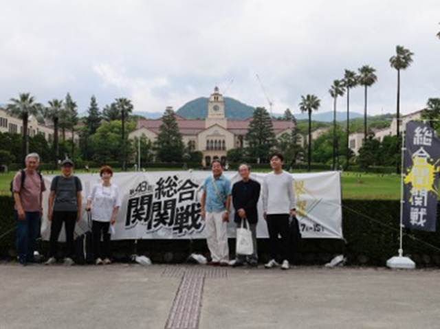 西宮支部総合関関戦。関西学院大学西宮上ケ原キャンパスで健闘する母校選手を応援 2025年06月15日 関西学院大学西宮上ケ原キャンパスで開催された総合関関戦の最終日、6月15日(日)に西宮支部の有志で応援に行きました。 静寂を切り裂く弓弦の音、激しい竹刀の打撃。めまぐるしいラクロスの攻防。 身体の衝突で作り出すハンドボールのパスコース。 総合優勝は逃しましたが、母校の名前を背負って頑張っている後輩の姿に感動し、ともに応援することで母校の絆を強く感じた一日になりました。