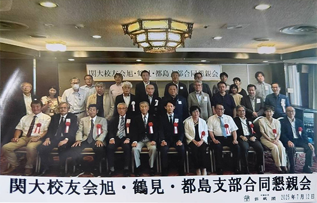 鶴見支部におきましても、久しぶりに会う交友との話が弾むなかで、議事に入り、議案1号から第3号(R7年度の事業計画、予算等)スムーズに可決され、また今年度行事や、若手校友の勧誘等などの討議を終え、総会は終了しました。次に懇親会場に移動し、来賓を交えた集合写真のあと、3支部合同懇親会の始まりです。