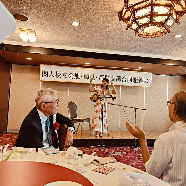 沖縄出身の藤本真希さん(都島)の三線による民謡、島唄など美しい音楽を堪能し、玉置さん(都島)の司会のもと、学歌斉唱、香西都島支部長の開会挨拶、仁井校友会会長、市内支部連合会副会長 井本 暁人さんの乾杯の音頭で楽しい宴会が始まりました、
