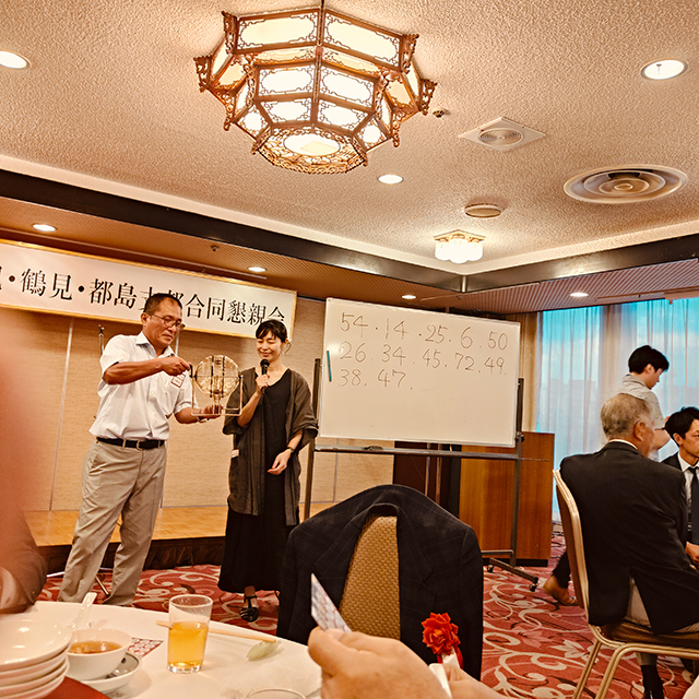 おいしい料理に満足し、またアトラクションとして、鶴見支部担当の恒例ビンゴゲームです、井藤さん、原邊さんご夫妻(両人とも関大)により、楽しい商品をゲットできた校友は満足で、ニコニコ顔です、ちなみに私は1番に当たりました(神様の御利益です)。また、逍遙歌、西支部長 西村輝和さんの大阪締め、楽しい宴も最後に、秋田都島支部長の閉会の挨拶でお開きとなりました、「また、来年元気で会いましょう」で解散となりました。