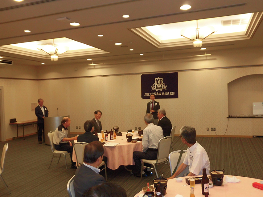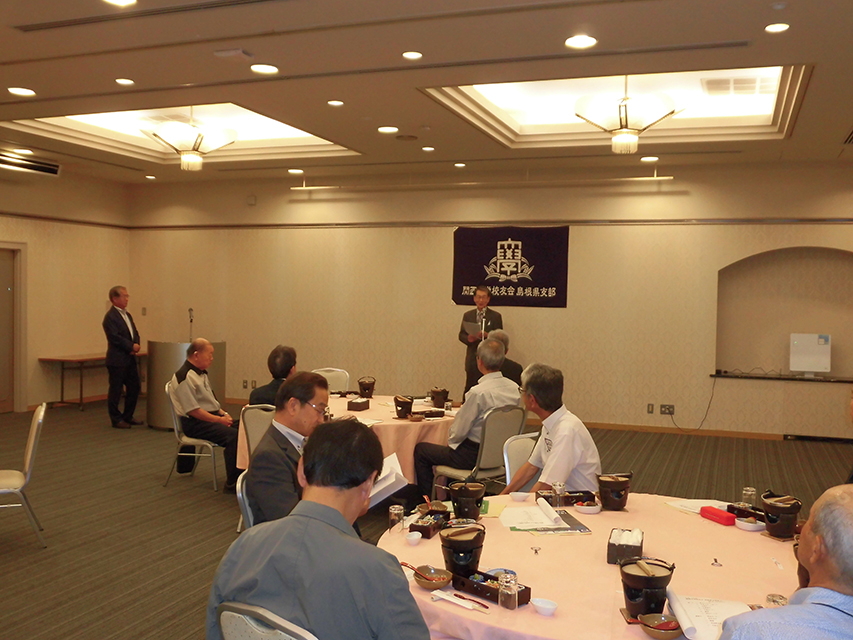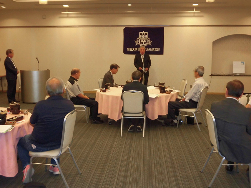 島根県支部令和7年度支部総会を開催 -出雲駅伝応援を中国経済人クラブと連携して- 2025年07月20日 令和7年7月20日「サンラポーむらくも」にて、本部組織部より清川秀樹様、平松正崇様のご臨席を賜り、令和7年度島根県支部総会が開催された。 学歌斉唱、蘆田会長の挨拶の後、ご来賓より情勢報告、そして、経過報告、会計報告の後、宴に入り、金山前会長の一本絞めで無事終了した。 また、来る10月の出雲駅伝に関大が3年連続で出場することから、今回は島根県支部と関西大学中国経済人クラブ(会長:清川秀樹様)と連携共催して全力をあげて応援することとした。 (文 ・ 杠 良智)