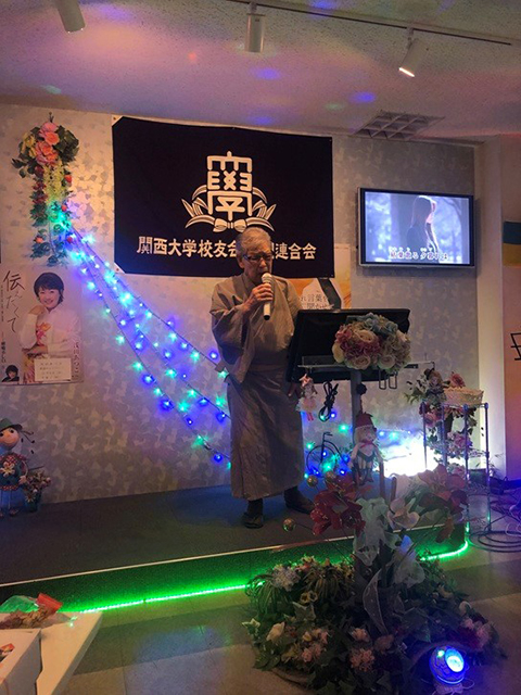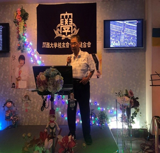 最初に学歌斉唱し、溝端会長(昭和44・法)の開会挨拶、西出部会長(昭和51・法)乾杯音頭で開会し、4役員の挨拶替わりの4曲を皮切りに、全員各1曲1コーラスを歌い、カラオケバトルを開催致しました。成績は下記の通りです。
