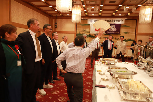 宴もたけなわとなる中、参加校友全員が肩を組み大きな輪をつくり、石原美之会計監事の音頭で逍遙歌を1番から3番まで熱唱。なごりを惜しみつつ、お開きを迎え、参加校友は、お土産の市制100周年銘酒セットを手に帰路につきました。