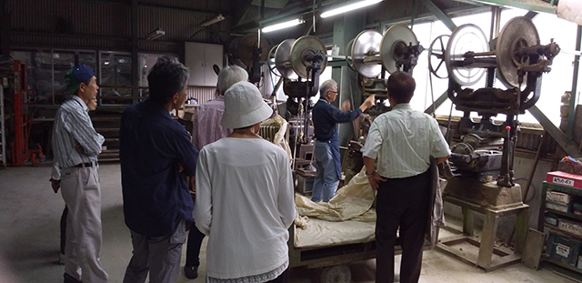 ①最初に、ミハラ(株)瓦工場の見学。四台の窯焼き機を備えて、実際に瓦焼きを見せていただきました。すごい音で発火しました。現在の瓦の需要は、家の屋根だけではなく、建物の壁や装飾に注文があるようです。とても勉強になりました。
