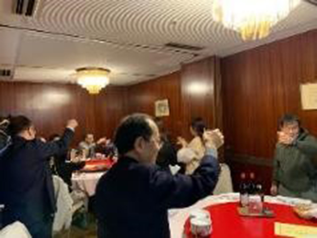 懇親会は、例年どおり平川門向いの赤阪飯店へと場所を移し、徳田氏の乾杯ご発声でスタート。今回も東京センターの山本さんにも参加いただき、中華料理に舌鼓を打ちながら昭和44年卒から平成10年卒まで幅広い層の懇親が深められました。山本さんから11月22日(土)富士通スタジアム川崎で開催されるアメフト部の対明治大学戦の応援への呼びかけのあと次の世代に向けて東京支部による「皇居散策懇親会」の永続的な開催を誓い、濱鍋大先輩に締めて頂き会の閉会となりました。
