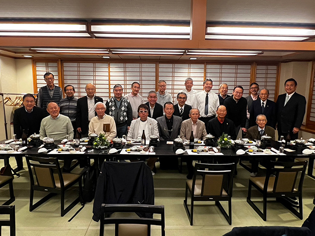 撮影後、田中義昭顧問(校友会参与)による元気なお姿での乾杯のご発声を皮切りに、歓談へと移り、役員それぞれが今年の出来事や行事の振り返り、さらには来年の行事についての意見交換を行った。