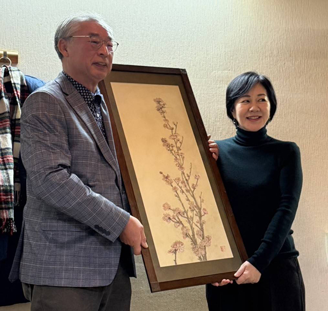 今年なくなられた支部校友を悼み黙祷を捧げた後、懇親に移り、歓談の輪を広げました。今回は、お忙しい中、支部校友で衆議院議員の三木けえさんも参加。春の院展に出展を果たした宮田有恒さんから「望春・桃」のスケッチをプレゼントしました。