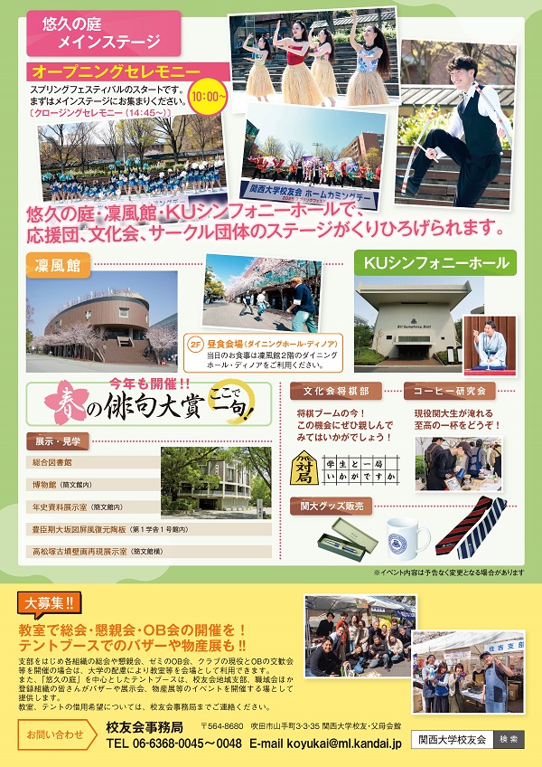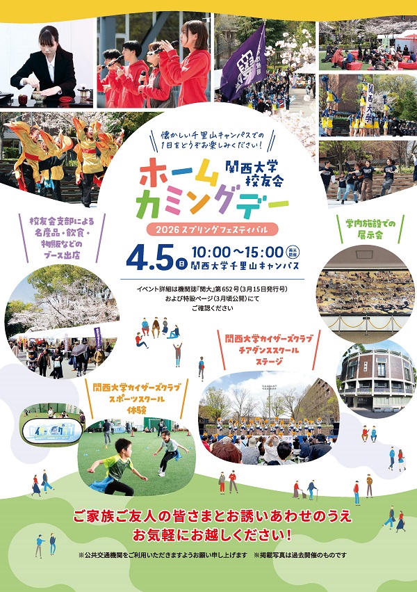 【お知らせ】4月5日 ホームカミングデー ~2026スプリングフェスティバル~ を開催 2026年01月26日 ホームカミングデー ~2026スプリングフェスティバル~ を開催いたします。ぜひ、お誘い合わせのうえ、桜の花咲く母校へおかえりください。日時:2026年4月5日(日)10:00~15:00場所:関西大学千里山キャンパス詳細は、後日お知らせいたします。また、特設サイトを3月に公開予定です。