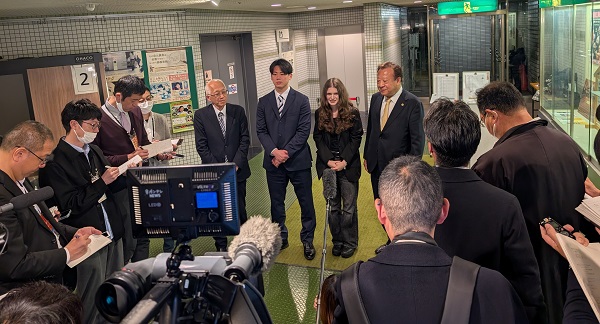 取組後に行われた各メディアの囲み取材では、安青錦関の来日のきっかけともなった元相撲部主将で現大学事務職員の山中新大氏が「良いときもあれば悪いときもある。今場所は必ず今後につながる経験になる」と語り、静かな言葉の中に、安青錦関への深い期待がにじみました。また、ウクライナ人留学生のポルチェンコ・マリア・ソフィアさんは「(安青錦関の)活躍を同じウクライナ人として誇りに思う」と述べました。芝井敬司理事長は「今は試練の時。大学として引き続き応援していきたい」と語り、田中義信校友会長も「これだけ多くの校友が応援している。今後の活躍を心から期待している」とエールを送りました。